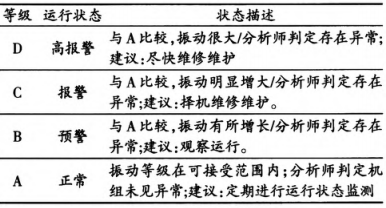 根据立磨主减速机参数,参考国际标准ISO 10816-3,规定各个级别的报警参数限值如下:正常(绿色):<3.5mm/s;预警(黄色):≥3/5mm/s;报警(橙色):≥7.1mm/s;红色(危险):≥11.0mm/s。各级别报警状态描述见表1。