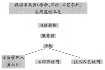 系统采用进口振动传感器,使用远程预知性维修控制系统,参照先进国际标准ISO 10816-3,对采集数据值根据实际情况(包括工况、工艺、润滑情况等)进行分析,为现有设备量身定做预、报警值,实时监控,随时查看并提取运行状态下的振动数据。一经监测到生产设备的各项运行参数出现异常,可根据实际情况指定维修方案进行维修,这样能大大提高生产率,延长设备的维修周期和使用寿命,降低设备的事故发生率,为企业创造直接的可观经济效益,在线监测流程见图1。