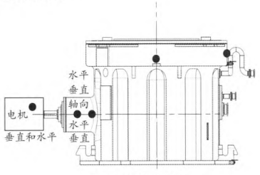 振动加速度传感器测点布置原则是:沿振动测点到传感器路径距离最短、且刚性最大。考虑测点布置的经济性,每个轴承沿径向至少应考虑安装一个加速度传感器,对于承受轴向力的轴承,还应考虑加测轴向振动。润滑监测安装在回油管路。该公司减速机共分布10个监测点,其中振动测点9个(电机2个:驱动端垂直和水平;高速轴5个:其中前端3个,水平、垂直和轴向,后端2个,水平和垂直;内齿圈2个:12点方向和3点方向),润滑测点1个。测点位置如图2。