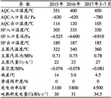 从表2可以看出,随着篦冷机改造以及AQC锅炉取风口前移和双阀门调节控制,AQC锅炉进口烟风比原来提高了50℃以上,AQC锅炉进口负压提高了150Pa,而AQC锅炉出口温度没有上升,AQC锅炉工作效率提高明显,AQC锅炉蒸汽压力和温度也将随之提高;SP锅炉进口温度比原来提高了25℃左右,在高温风机同样转速的条件下,进口负压提高300Pa,锅炉的通风量明显提高,旁路漏风量减少明显,SP锅炉工作效率得以提高;主蒸汽温度和压力逐年提升,主蒸汽量比原来提高了4t/h以上,为发电提供了更多更优质的蒸汽;凝汽器工作更加稳定高效,避免了因排汽温度高而造成的效率下降问题,端差温度可长期控制在5℃以下,真窑度能稳定在-0.08MPa左右;发电功率提高明显,吨熟料发电量提高了3.5kWh/t。