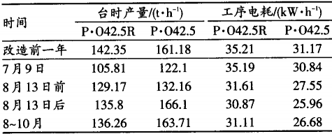 由表3可知,试用陶瓷球后,P·O42.5R水泥工序电耗下降了4.10kWh/t,下降了11.64%;P·O42.5水泥工序电耗下降了4.49kWh/t,下降了14.40%。P·O42.5台产提高了2.53t/11,提高了1.58%;P·O42.5R台产降低了6.09t/h,下降了4.28%。