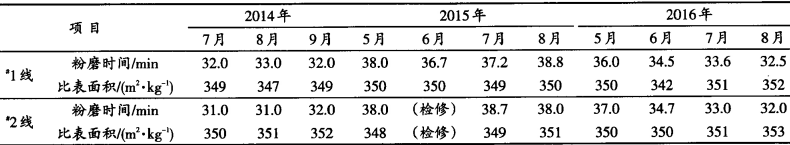 表2 2014~2016年熟料粉磨时间与比表面积