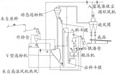 如图1所示,系统工艺流程是:自原料配料库来的物料由皮带机(改造原有输送皮带)送入V选进行烘干。该皮带机上将增设除铁器、金属探测仪,当探测到金属异物时发出报警信号,气动三通阀动作后将含有金属异物的物料外排。不含金属异物的物料送入V选进行烘干后喂入辊压机进行挤压,经辊压机挤压后的物料由提升机送入V型选粉机;经V型选粉机分离出来的粗料由提升机送回稳流仓,继续循环辊压;细粉随气流进入动态选粉机,经动态选粉机分离后的粗粉进入斗提混合均匀后送回稳流仓,成品细粉随气流进人旋风分离器;经旋风分离器分离后的成品细粉通过斜槽送入生料均化库。