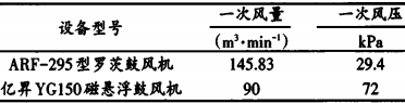 低氧燃烧是通过降低煤粉燃烧的过剩空气系数,进而降低燃料周围氧浓度,达到降低燃烧温度峰值减少热力型NOx生成的目的。改造前该公司窑头燃烧器为DBC-220-550-8型燃烧器, 这种燃烧器的特点主要体现在高一次风量、低一次风压,窑头配备ARF-295型一次风机, 风量145.83m3/min, 风压29.4kPa, 虽有利于形成稳定的火焰, 对煤质的适应性较强,但大量低温的一次风进入回转窑内,不仅造成热耗上升,也会增加热力型NOx生成量。为降低煤耗,减少NOx生成量,公司对窑头燃烧器进行了技改, 采用DJGX-5000T/D-T型低氮燃烧器替换原燃烧器,同时采用YG150磁悬浮鼓风机替换罗茨风机, 一次风量90m3/min, 风压72kPa。改造前后一次风机主要参数见表1。