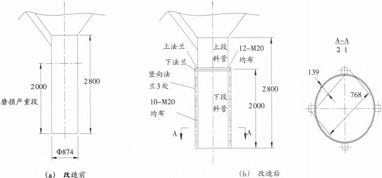 图1 立磨下料管检修改造前后对比