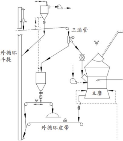 某公司拥有一条5000t/d水泥熟料生产线,于2009年9月建成投产。其生料制备为一台艾法史密斯ATOX50立磨,原料配料主要有石灰石、砂岩、煤矸石、工业废渣(湿粉煤灰、硫酸渣、铅锌渣),其喂料及外循环系统工艺布置情况见图1。